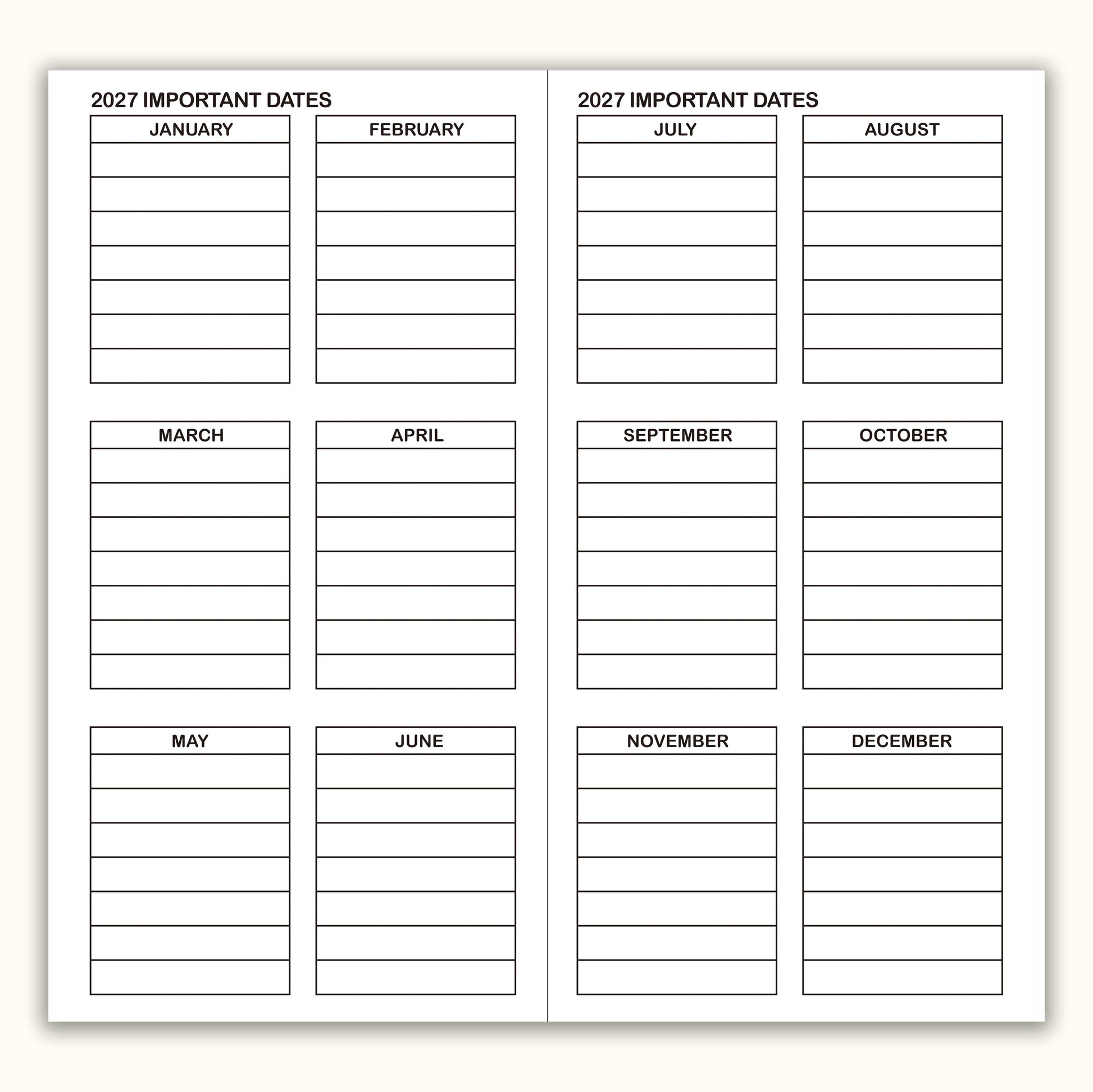 - Important Dates: 1 page for 6 months.